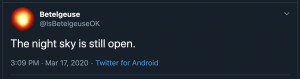Welcome to Canterbury Astronomical Society › Forums › Canterbury Astronomical Society Forums › Astronomy (Public Forum) › Keep looking up Tagged: Betelgeuse, humour This topic has 0 replies, 1 voice, and was last updated 5 years, 10 months ago by John Pickering. Viewing 1 post (of 1 total) Author Posts March 17, 2020 at 10:49 pm - Views: 29 #2497 John PickeringParticipant A message from Betelgeuse … Author Posts Viewing 1 post (of 1 total) You must be logged in to reply to this topic. Log In Username: Password: Keep me signed in Log In John Pickering