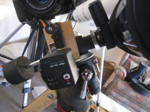 Single 9×50 binocular lens (monocular now!) with right angle mirror on ball mount on polar aligned 24 hour clock mechanism (tracking).