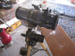 80mm f/5 “Cometron” short refractor on camera tripod. 25mm Celestron Kellner EP. Laser finder (SOLD)