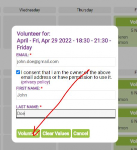 Enter your name – email address and then click volunteer: